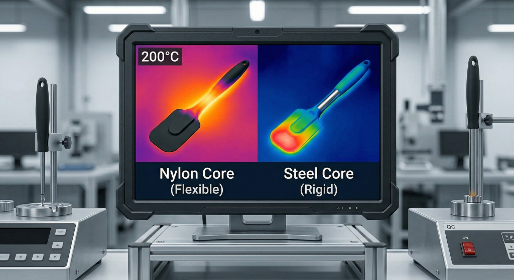 Heat resistance determines whether a tool survives intense stovetop cooking environments daily. Researching how to choose silicone manufacturer requires reviewing their high-temperature testing protocols closely. Steel centers handle ambient pan temperatures exceeding five hundred degrees Fahrenheit easily. Nylon centers soften quickly when exposed directly against blistering metal cooking pans.