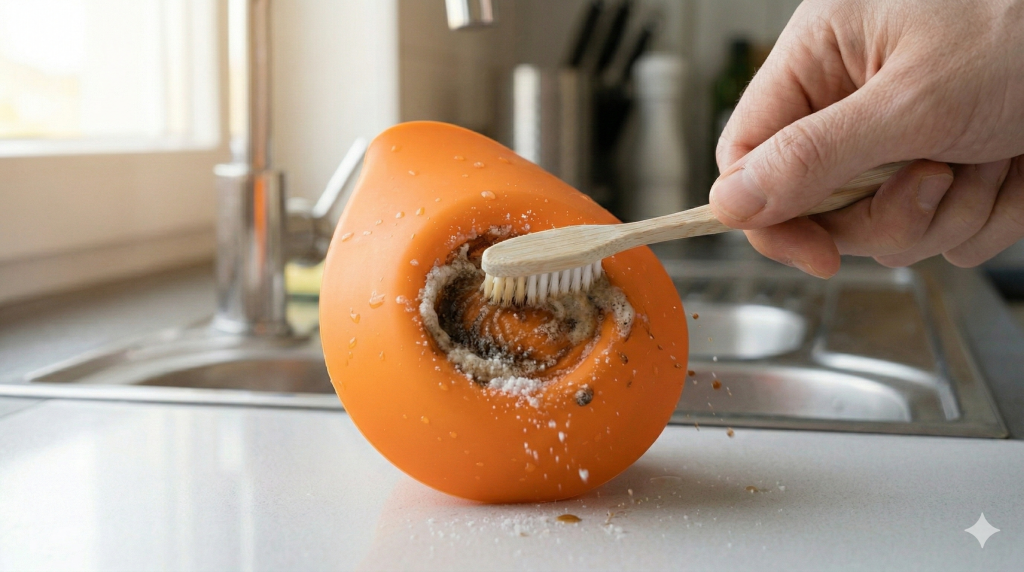 Always use silicone-based brushes or soft sponges to tackle discoloration. Hard plastic bristles or metal scouring pads will cause micro-tears in the material.