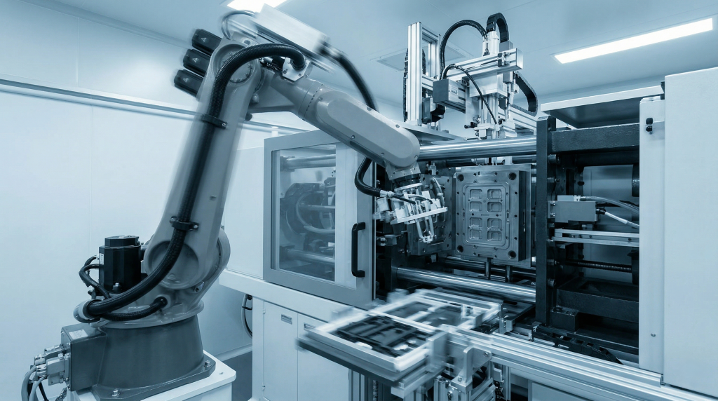 Medical components require dust-free environments continuously. Automated lines operate entirely inside Class 100k cleanrooms.