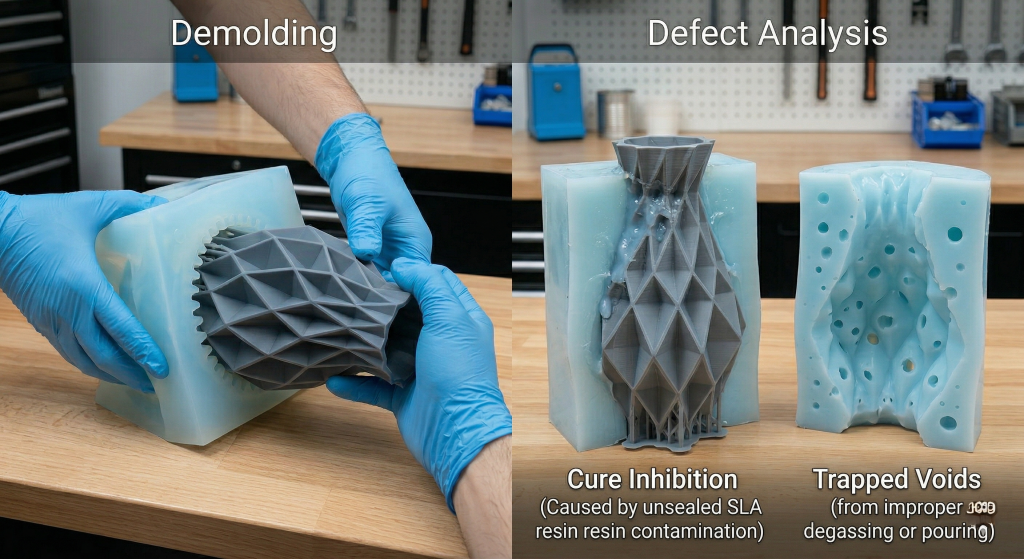 Cure inhibition happens when a chemical contaminant on the master model prevents the rubber from cross-linking and solidifying properly. This disastrous chemical reaction leaves a sticky, gooey mess directly on the surface of your otherwise perfectly solid block.