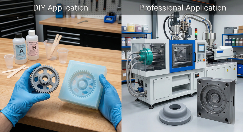 In a DIY setting, hobbyists typically use pourable tin-cure kits to make small crafts or one-off art pieces. Professionals, on the other hand, utilize heavy-duty injection molding machines and industrial-grade compounds to produce thousands of identical parts daily.