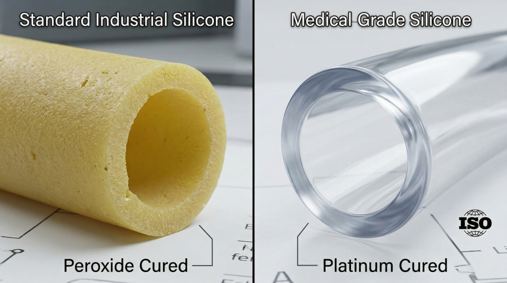 Key Takeaway: Choosing platinum-cured elastomers over standard peroxide-cured options guarantees superior purity, better physical properties, and absolute compliance with medical safety regulations.