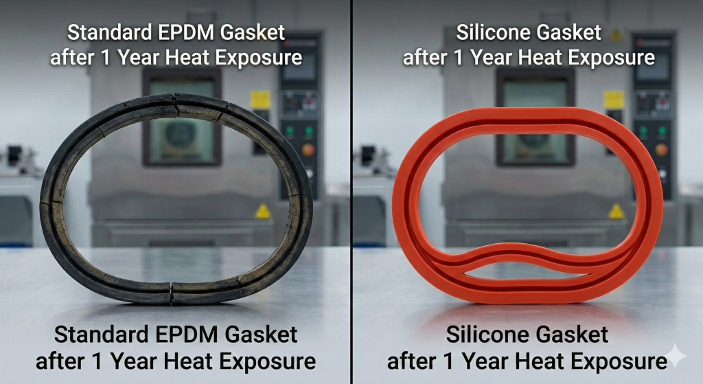 Many elastomers lose their “stiffness” as temperatures rise, causing them to squeeze out of the seal gap—a phenomenon known as creep. Silicone is uniquely resistant to this type of mechanical failure. It retains its Shore A hardness throughout its operating range, ensuring it remains a robust barrier.
